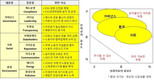 대표이사·사외이사·경영진·ESG경영실장 등 총 7인으로 구성된 ESG경영위원회를 설치하고 ESG경영실, ESG실무추진단, ESG자문단, ESG분과별연관위원회, ESG워킹그룹을 조직했다. 친환경 항만 생태계 구현, 상생과 협력의 항만사회 가치 증진, 공정과 신뢰의 지배구조 확립 등의 전략 방향을 설정했다. 외형적으로 ESG 경영을 실천하기 위한 체계는 잘 구축돼 있다.