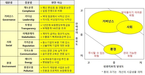 환경(Environment)은 무리하게 실적을 채우려는 노력보다는 보증 프로젝트의 성공 가능성을 신중하게 검토해야 한다. 예를 들면 저수지 태양광 사업은 노후화된 태양광 패널에서 납·비소 같은 독성 물질이 나올 수 있어 식수원을 오염시킬 수 있기 때문이다.