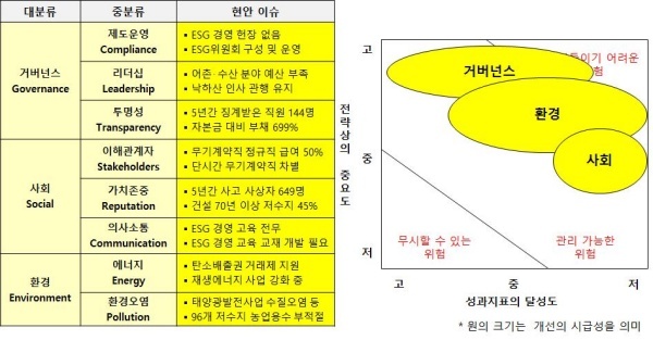 거버넌스(Governance·지배구조)는 ESG위원회를 구성해 ESG 경영을 추진하고 있지만 정작 ESG 경영헌장이 없다는 점은 감안했다. 농촌과 관련된 사업은 활발하게 전개하지만 상대적으로 어촌은 소홀하게 대한다는 지적도 겸허하게 수용해야 한다. 다른 공기업과 마찬가지로 낙하산 인사 관행은 사라지지 않았다.