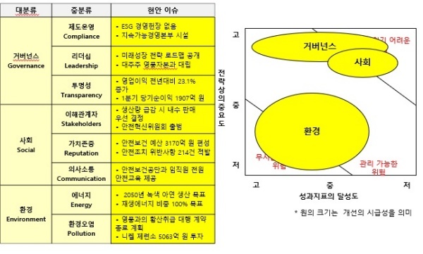 △거버넌스(Governance·지배구조)=제도운영에서 포스코홀딩스와 마찬가지로 ESG 경영헌장조차 제정하지 않아 ESG 경영에 대한 의지가 의심된다. 지속가능경영본부를 신설하며 ESG 경영을 체계화할 필요가 있다.