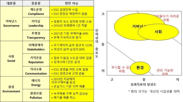 △사회(Social)=무기계약직의 급여가 정규직에 비해 많은 사례는 공기업에서 드문 현상이다. 여성의 급여도 남성의 80%로 높은 편이다. 학령인구의 감소로 우리나라 대학은 벚꽃이 피는 순서대로 남쪽부터 망한다는 자조적인 말이 있음에도 정작 지원금은 수도권 대학에 집중됐다. ESG 경영을 구현하기 위한 자체 교육도 전무했다.