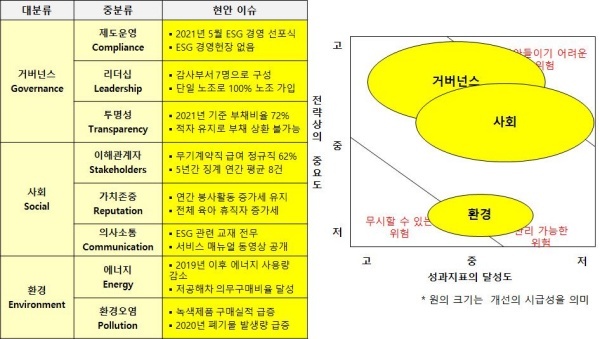 △거버넌스(Governance·지배구조)=지난해 ESG 경영을 추진하겠다고 선포했지만 현재까지 ESG 경영헌장을 제정하지 않았다. ESG 경영은 구호보다 행동이 우선해야 구현될 수 있으며 헌장을 제정해 임직원을 설득해야 한다. 부채비율이 높음에도 적자에서 벗어나지 못해 경영정상화가 절실하게 요구된다.