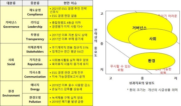 △거버넌스(Governance·지배구조)=2021년 ESG 경영 추진 전략을 선포했지만 정작 ESG 경영헌장을 제정하지 않았다. 종합청렴도가 4등급 이하로 낮으며 경영평가 지적 사항도 안전·환경, 윤리경영과 같은 ESG 경영의 기반이 되는 내용이 많아 개선이 시급한 실정이다. 2017년 이후 자본 잠식상태이며 부채도 지속적으로 늘어나 정상적인 경영이 어렵다.