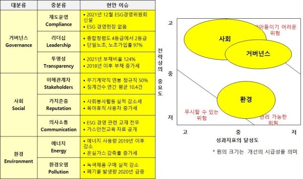 △거버넌스(Governance·지배구조)=2021년 12월 ESG경영위원회를 신설하고 지난해 ESG 경영 문화주간을 시행할 정도로 ESG 경영에 대한 관심은 높은 것으로 보인다. 인권헌장·윤리헌장은 마련했지만 ESG 경영헌장을 제정하지 않아 구체적인 지향점을 파악하기 어렵다. 종합청렴도가 개선된 점은 긍정적이다.
