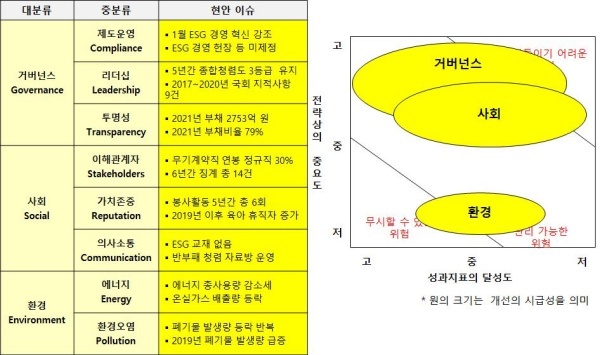 △거버넌스(Governance·지배구조)=설립한 후 46년 동안 과학기술 발전에 큰 공을 세웠지만 5년간 종합청렴도가 3등급을 유지한 것은 조직 전반에 걸쳐 혁신이 필요하다는 것을 반증한다. ESG 경영 혁신을 강조했지만 정작 기본적인 헌장·선언문·추진체계·추진조직 등은 정하지 않았다.