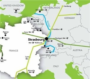 스트라스부르, 카를스루에, 바덴바덴, 바젤, 뮐루즈, 취리히, 뮌헨, 프랑크푸르트, 슈투트가르트 등 7개 공항이 있다. 또한 스트라스부르는 유럽 28개 도시, 약 48만 명의 인구가 살고 있는 유로메트로폴에 속한다.