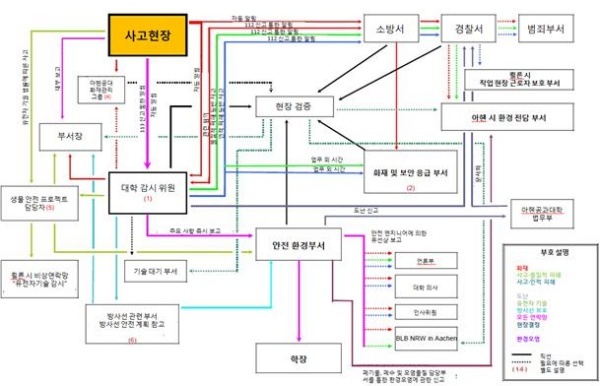 ○ 아헨 공대의 경우 약 40명이 안전관리 부서에 종사하고 있는데 이 중 최고 엔지니어와 부서장, 프로젝트 책임자, 안전관리 전문가 등이 이 기준을 정하고 있다. 이는 외부 컨설팅 회사에 위탁을 맡기는 경우도 있다.