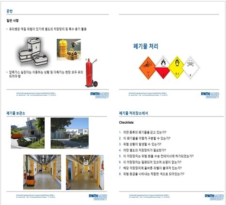 ○ 폐기물을 처리하기 위해서 아헨 공대에서는 별도의 폐기물 처리 장소를 운영하고 있다. 이곳에서는 폐기물을 반납하기 전에 필수적으로 확인해야 하는 체크리스트를 갖고 있다.