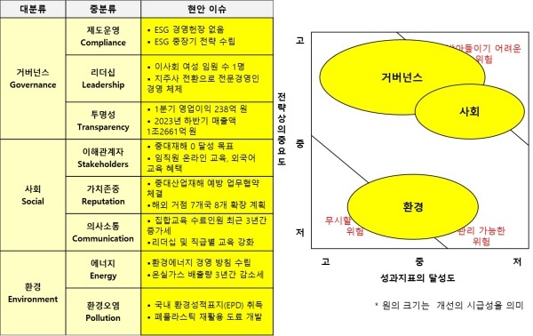 △거버넌스(Governance·지배구조)=거버넌스는 ESG 경영 헌장을 제정하지 않았으며 아직 윤리경영 수준에 머물고 있어 개선이 필요하다고 판단된다.