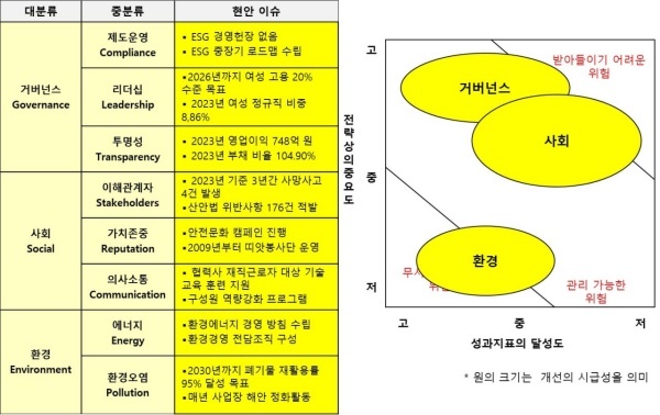 △환경(Environment)=환경은 2030년까지 페기물을 감축하는 환경경영시스템을 강화하는 점은 좋다. 자원순환 정책을 통해 전 직원을 폐기물 줄이는 업무에 투입하고 있다. 하지만 고성 사업장의 폐기물 배출량은 증가 추세를 보여 개선이 불가피하다.
