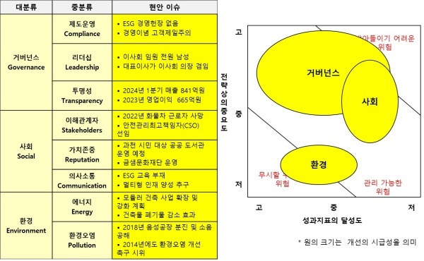 △거버넌스(Governance·지배구조)=거버넌스는 기업 이념에 인간경영과 윤리경영이 포함돼 있지만 현장에서 실천하려는 노력은 부족한 것으로 평가받았다. 대표이사와 이사회 의장은 동일인이 맡고 잇으며 이사회는 남성만으로 구성돼 있다.