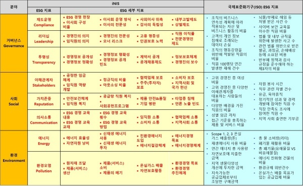 마지막으로 환경(E)은 팔기생태계가 ISO의 지표보다 더 광범위하다는 것을 파악할 수 있다. 팔기생태계는 △에너지 효율성 △신재생 에너지 사용 △친환경에너지 도입 △에너지경영 목표 △자연자원 낭비 △신재생 에너지 투자 △에너지절감체계 △에너지경영체계 △원자재 조달 △제품(서비스) 소비 △온실가스 배출 △환경경영 목표 △제품(서비스) 생산 △제품의 폐기 △자연보호활동 △ 환경경영 추진체계 등을 개발했다.