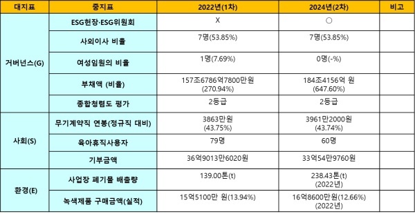 △환경(Environment)=환경은 사업장 폐기물 발생량과 온실가그 배출량이 2021년 이후 급증하고 있어 환경경영에 대한 의지가 의심스럽다. 녹색제품 구매액은 증가하지만 구매액 비율은 하락했다.