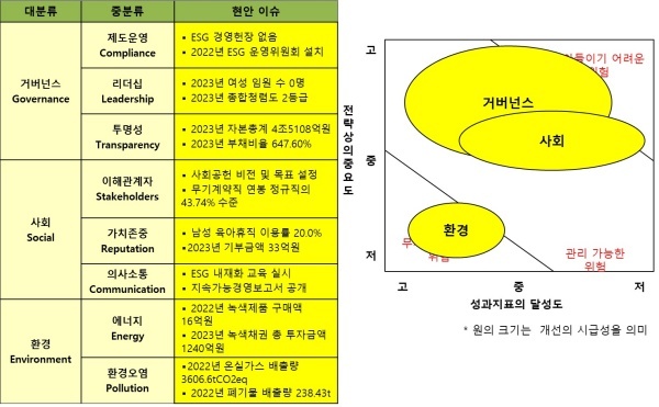 ESG 전략은 △미래를 위한 녹색책임 이행 △든든한 사회 책임경영 강화 △건전하고 투명한 지배구조 확립이다. 홈페이지에 ESG 경영헌장은 부재했다.