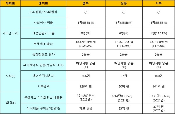 △거버넌스(Governance·지배구조)=거버넌스는 한국전력공사와 더불어 지금까지 다룬 발전 자회사 모두 ESG 헌장을 제정하지 않았다. ESG 비전, 경영전략 방향, 위원회, 실무 추진단 등은 정비했다.