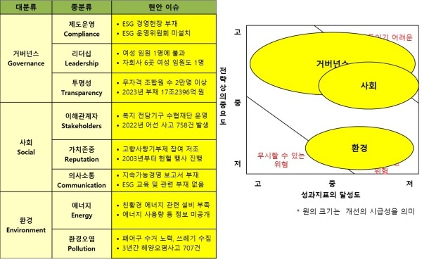 △환경(Environment)=환경은 에너지 관련 지표를 찾아보기 어려웠다. 환경오염은 폐어구를 수거하기 위해 노력하고 있으며 쓰레기 청소 등도 펼치고 있어 긍정적으로 평가했다.