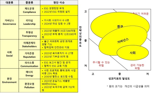 △환경(Environment)=환경은 녹색구매와 에너지 효율을 위한 환경 투자를 진행한다는 점에서 긍정적이다. 석유 정제 산업으로 인한 환경 오염은 불가피하나 온실가스 배출량이 근소하게 감소해 더욱 적극적으로 환경 오염에 노력을 기울여야 한다고 판단된다.