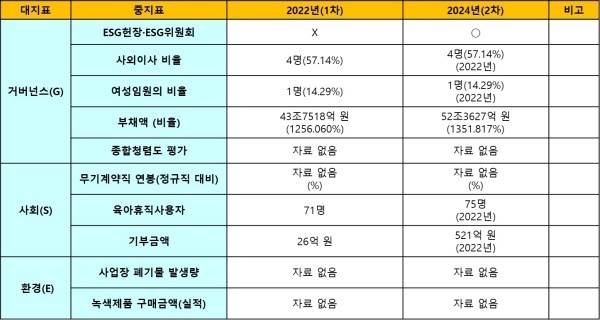 ◇ 2022년 및 2024년 ESG 성과 비교... ESG위원회는 구성했지만 환경 관련 지표는 자료 없음