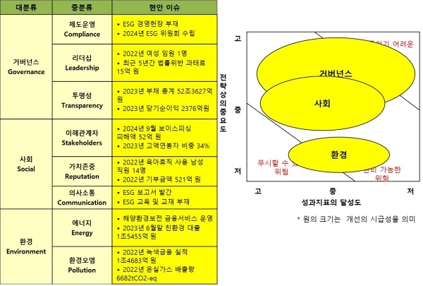 △거버넌스(Governance·지배구조)=거버넌스는 ESG 경영 선포에도 ESG 경영헌장을 수립하지 않은 점이 부정적이다. 법률 위반에 의한 과징금과 높은 수준의 부채 비중 또한 경영 투명성을 높여야 하는 부분이다.