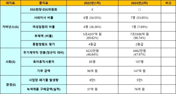 2022년과 2024년 2회에 걸쳐 ESG 경영을 평가한 결과는 조금씩 개선된 영역도 있지만 후퇴한 영역도 있어서 아쉽다. 세부 지표별로 간략하게 정리하면 다음과 같다.