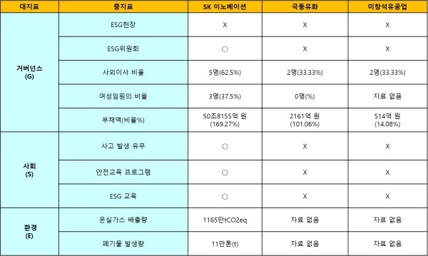 환경은 온실가스 배출량과 폐기물 발생량 모두 SK이노베이션만 공개했다. 다른 2개 기업은 환경에 관련된 최소한의 지표도 관리하거나 내놓지 않았다.