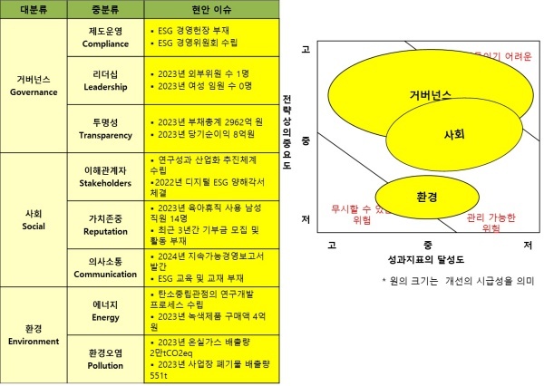 △거버넌스(Governance·지배구조)=거버넌스는 ESG 경영혁신'을 시도하고 있지만 정작 ESG 경영헌장은 제정하지 않았다. 아직도 윤리경영 수준에서 ESG를 이해하고 있는 것으로 판단된다.