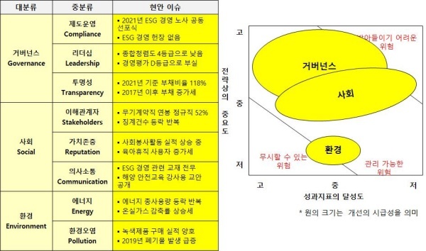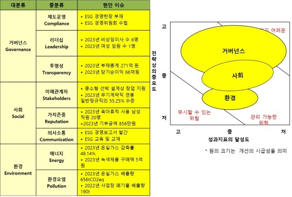 △거버넌스(Governance·지배구조)=거버넌스는 2022년 ESG 운영위원회를 신설했지만 여성임원의 비율 하락, 낮은 종합청렴도 등 전반적인 인식이 낮아 개선이 시급하다고 판단했다.