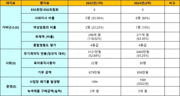 환경(E)은 사업장 폐기물 발생량은 2022년 190t으로 전년에 비해 감소했다. 녹색제품 구매금액은 2022년 2억원에서 2024년 5억 원으로 급증해 환경인식이 개선된 것으로 평가했다.