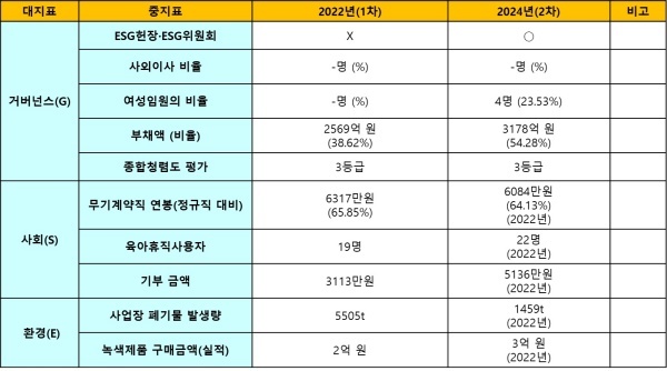 거버넌스(G)는 2022년 ESG위원회를 구성하지 않았다가 2024년 운영하고 있어 개선됐다는 평가를 내렸다. 하지만 ESG 헌장은 여전히 제정하지 않아 ESG 경영에 대한 의지를 의심할 수밖에 없다.