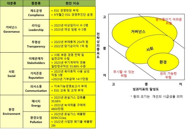 ESG 헌장을 제정하지 않았을 뿐 아니라 2023년 12월에서야 ESG 경영을 선포했다. ESG 경영추진단을 구성해 운영했지만 실질적인 성과는 찾아보기 어렵다.