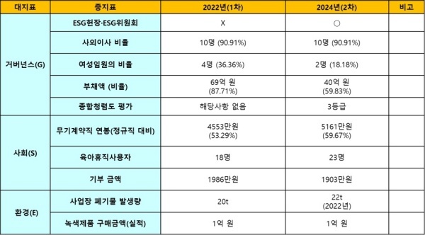 ◇ 2022년 1차 및 2024년 2차 ESG 경영 비교평가... 여성임원의 비뮬은 2년만에 절반으로 축소