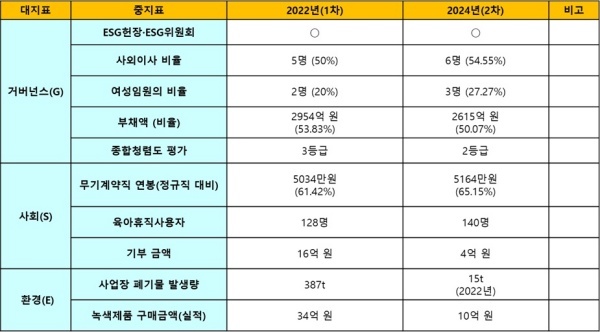 환경(E)은 사업장 폐기물은 2022년 387t에서 2024년 15t으로 급감해 양호한 평가를 받았다. 녹색제품 구매금액은 2022년 34억 원에서 2024년 10억 원으로 축소됐다.