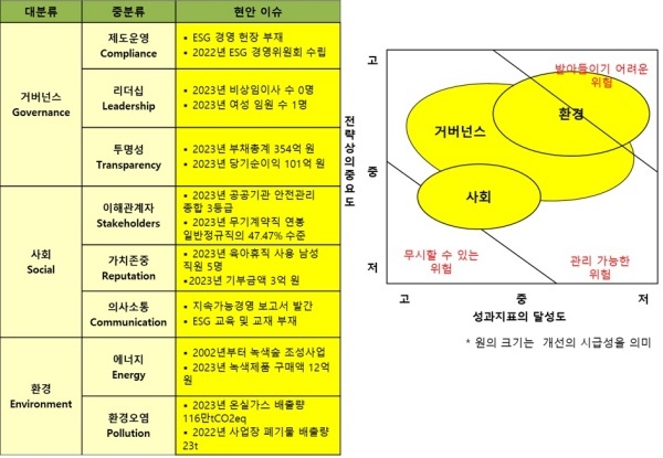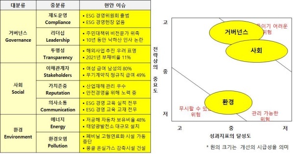 △거버넌스(Governance·지배구조)=거버넌스는 2022년 ESG 운영위원회를 구성했지만 정작 ESG 헌장을 제정하지 않았으며 구체적인 성과는 보이지 않는다.