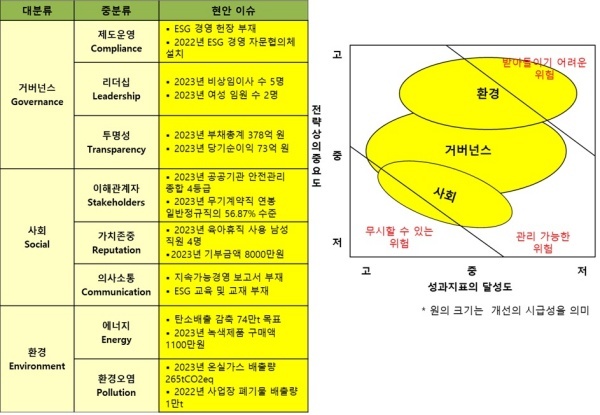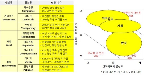 △거버넌스(Governance·지배구조)=거버넌스는 2021년 ESG 경영을 선포했지만 ESG 경영 헌장은 제정하지 않았으며 윤리경영 수준에 머물러 있다. 윤리헌장은 수립했으며 반부패 청렴 활동도 추진하고 있다.
