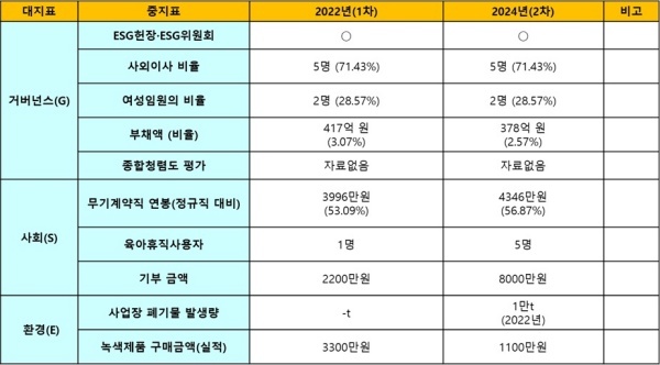 사회(S)는 평가 지표 모두 개선됐다. 정규직 대비 무기계약직의 연봉은 2022년 3996만 원에서 2024년 4346만 원으로 상승했다. 육아휴직 사용자는 2022년 1명에서 2024년 5명으로 늘어났지만 전체 대상자에 대한 정보가 없다.