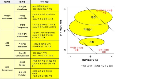 △거버넌스(Governance·지배구조)=거버넌스는 ESG 경영에 대한 준비가 전혀 되어 있지 않아서 개선의 시급성이 가장 큰 것으로 평가했다.