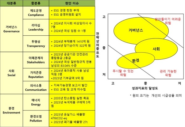 △거버넌스(Governance·지배구조)=거버넌스는 ESG 위원회는 구성해 운영 중이지만 ESG 헌장은 제정하지 않아 개선이 시급하다고 평가했다.