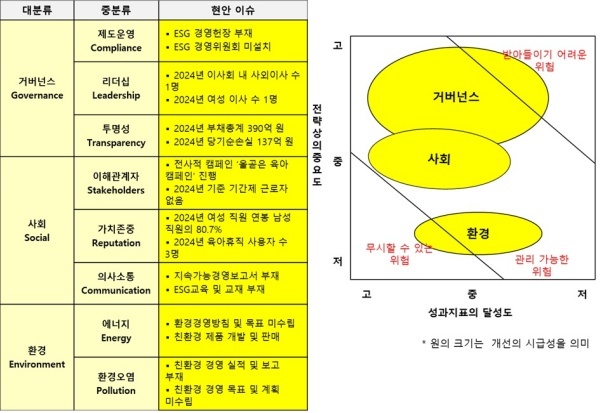 △거버넌스(Governance·지배구조)=거버넌스는 ESG 경영 헌장도 제정하지 않았을 뿐 아니라 ESG 경영위원회로 설치 않아 개선이 시급한 것으로 평가했다.