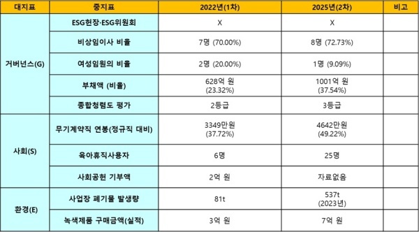 거버넌스(G)는 2022년 1차 평가 결과에 비해 2024년 2차 평가 결과가 악화됐다고 판단된다. ESG 헌장은 여전히 제정하지 않았으며 구체적인 ESG 경영 실적도 찾아보기 어렵다.