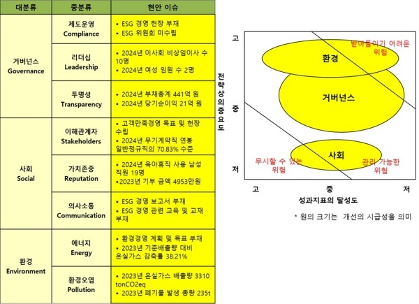 △사회(Social)=사회는 고객만족 경영을 추진하고 안전보건경영방침을 수립해 실천하는 측면에서 개선이 시급하지는 않다고 판단했다.