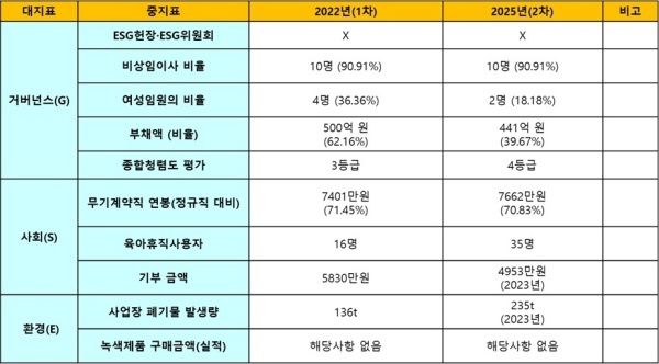 ◇ 2022년 1차 및 2024년 2차 ESG 경영 평가 비교... 거버넌스는 낙제점 및 사회·환경은 양호 평가