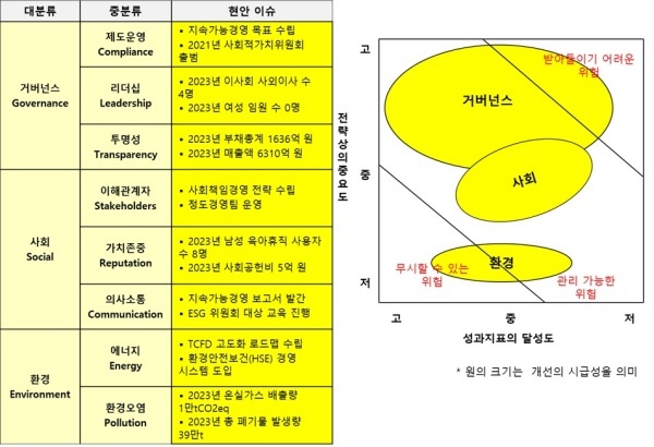 △환경(Environment)=환경은 환경안전보건경영을 추진하고 있으며 HSE 위원회로 환경 관련 활동을 강화해 개선의 여지는 크지 않다고 평가했다.