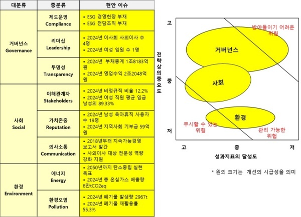 △거버넌스(Governance·지배구조)=거버넌스는 ESG 경영전략과 경영 비전을 수립했지만 정작 헌장이나 ESG 위원회는 구성하지 않아 개선이 시급하다고 평가했다.
