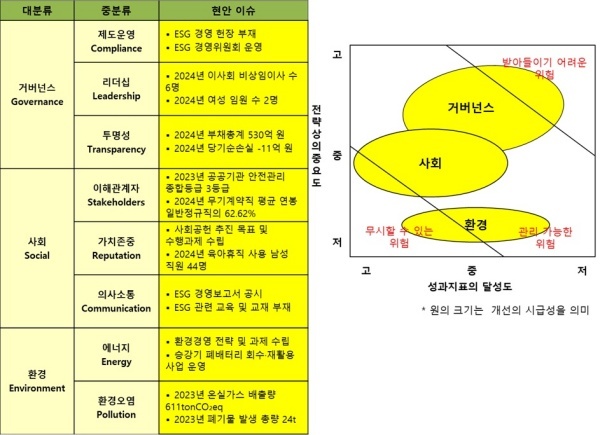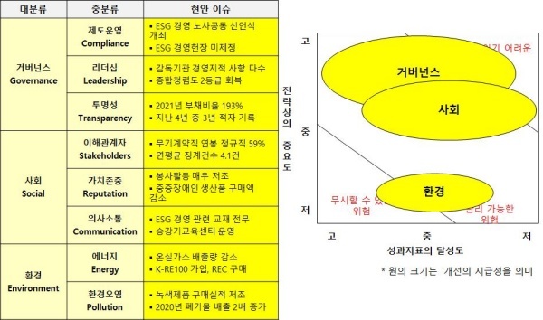 △거버넌스(Governance·지배구조)=거버넌스는 2021년 ESG 경영위원회를 구성해 운영 중이지만 구체적인 성과는 거의 보이지 않아 '개선이 시급하다'고 판단했다. 특히 4년이 지났지만 ESG 헌장조차 제정하지 않은 것은 문제가 있다.