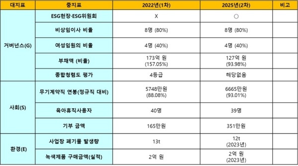 사회(S)는 무기계약직의 연봉 수준, 육아휴직사용자 수, 기부금액 등이 개선되며 '우수'로 판단했다. 특히 무기계약직의 연봉은 정규직 대비 88%에서 93%로 대폭 개선됐다.