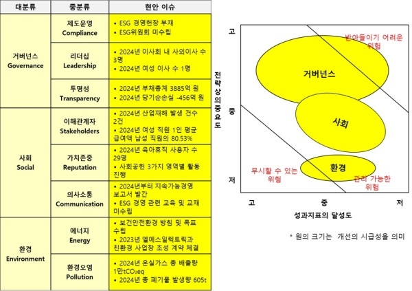 △거버넌스(Governance·지배구조)=거버넌스는 상장기업임에도 ESG 경영 헌장을 제정하지 않았으며 ESG위원회조차구성하지 않아 개선이 시급하다고 평가했다.