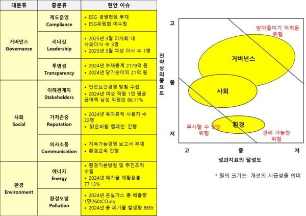 ◇ ESG 위원회조차 구성하지 않아 거버넌스 '낙제점' 수준... 사회공헌 활동은 '우수'해 개선 필요성 낮아