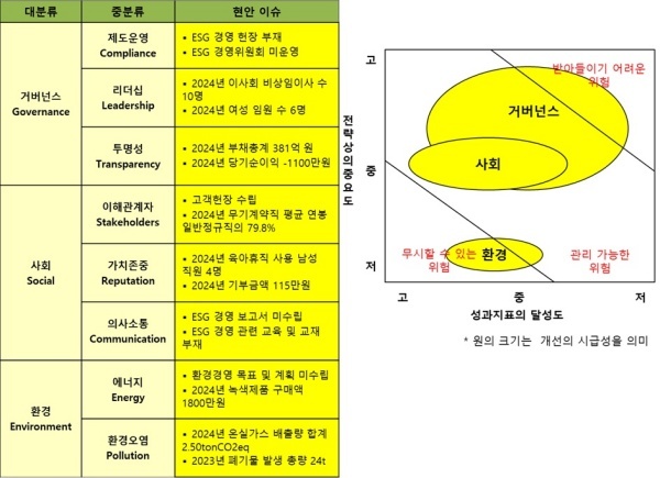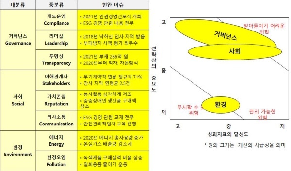 △거버넌스(Governance·지배구조)=거버넌스는 ESG 경영을 추진하기 위한 헌장 제정이나 위원회 구성조차 진행하지 않아 개선이 시급하다고 평가했다.