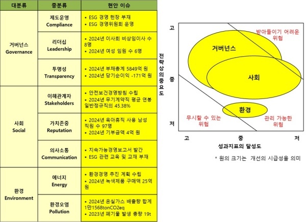 △거버넌스(Governance·지배구조)=거버넌스는 ESG 경영을 도입하고 경영위원회를 운영하고 있지만 경영 헌장조차 제정하지 않아 개선의 시급성이 크다고 평가했다.