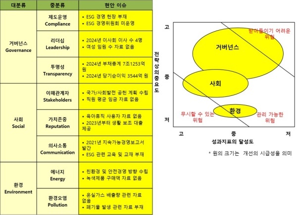 △거버넌스(Governance·지배구조)=거버넌스는 ESG 경영을 추진한다고 공언했지만 ESG 헌장을 제정하지 않았을 뿐 아니라 ESG 경영위원회도 구성하지 않아 개선이 매우 시급하다고 평가했다.